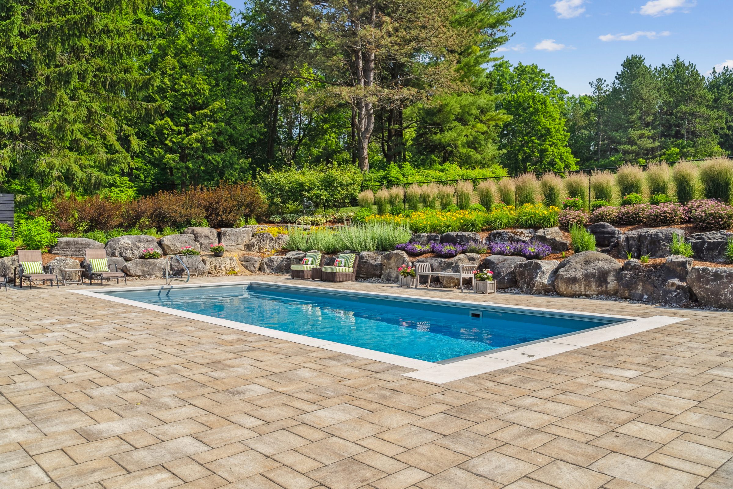 Luxurious backyard with elegant pool, cushioned lounge chairs, and a cozy patio setup. Lush greenery and flowers enhance the tranquil ambiance.