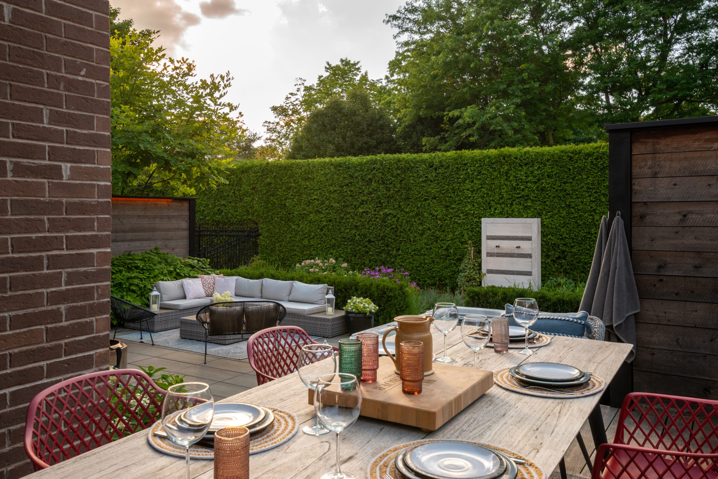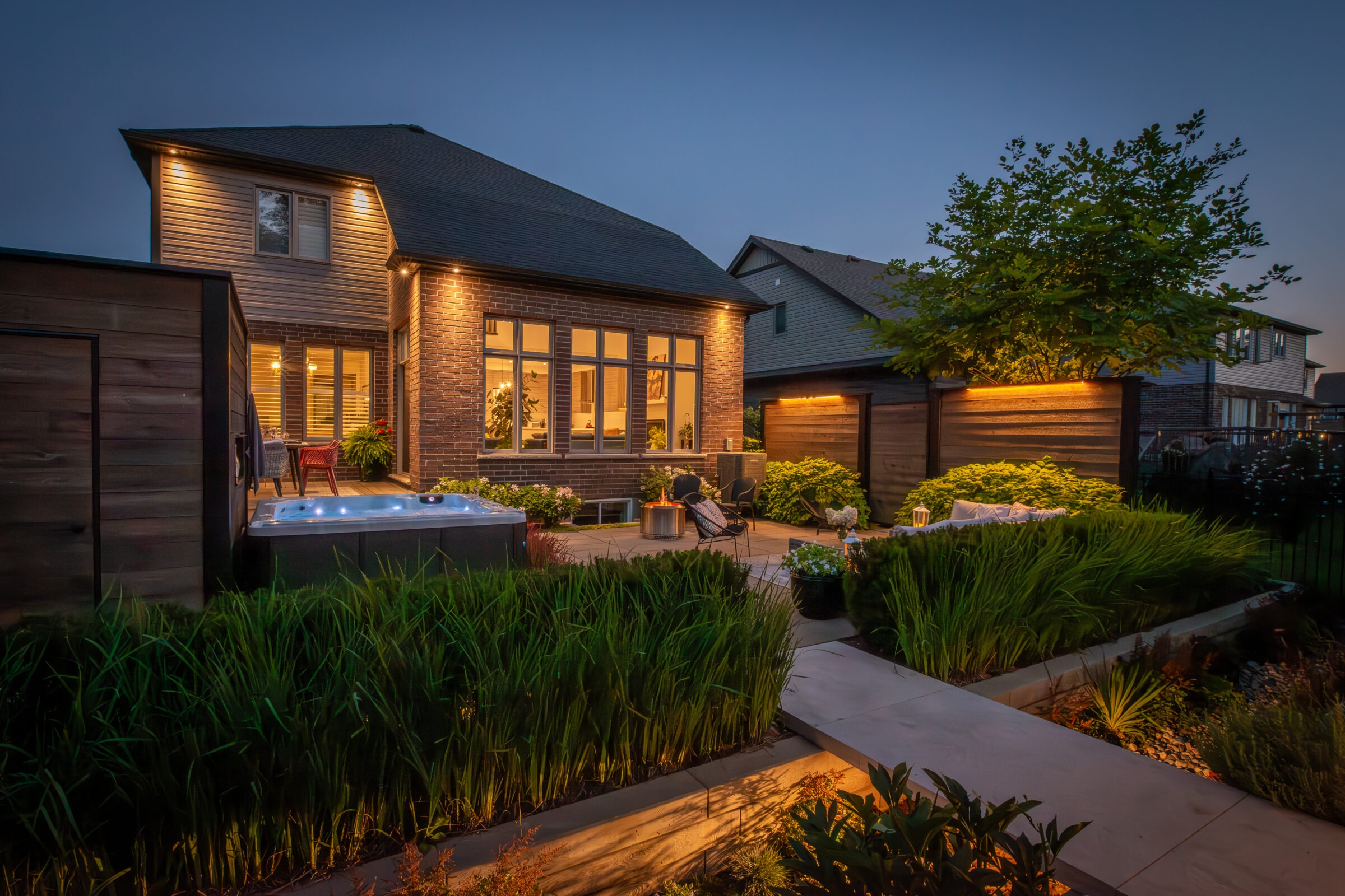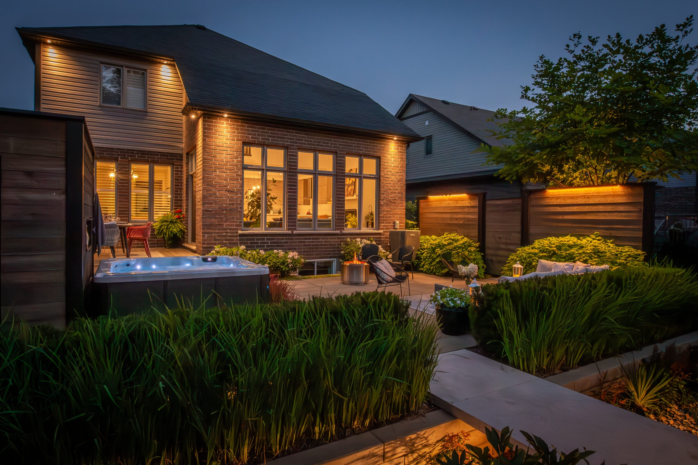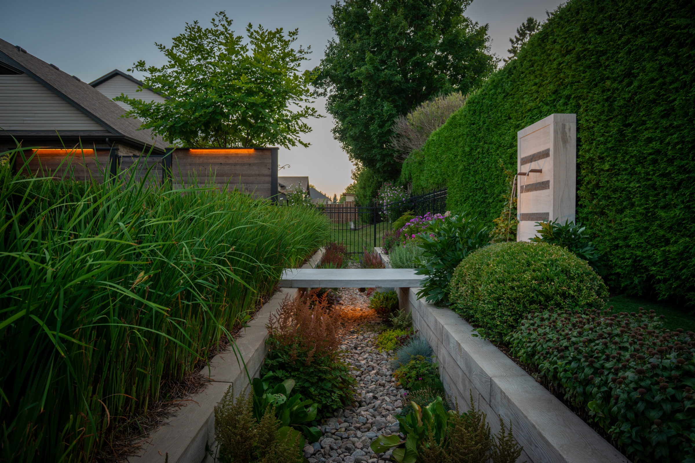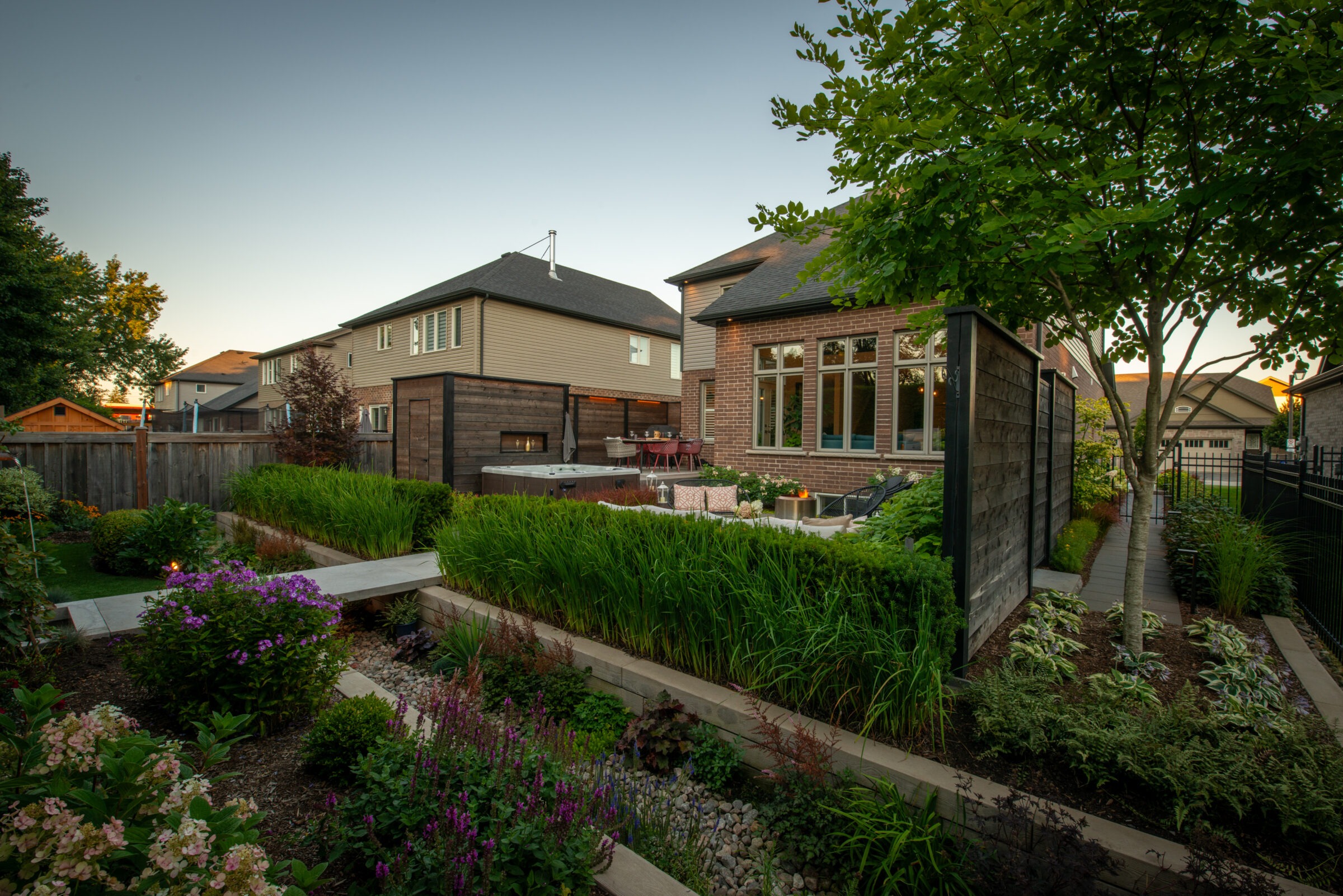 Westminster Gardens was designed as a private retreat that blends relaxation, entertaining, and year-round enjoyment. The backyard was transformed into a modern yet timeless outdoor living space centered around a spa and lounge area framed by lush plantings and warm privacy screens. An expansive sectional and fire feature create cozy gathering spots, while a custom dining terrace invites family and friends to share meals outdoors. Carefully planned gardens, pathways, and accent lighting tie the spaces together, creating an inviting retreat that feels like an everyday escape at home.