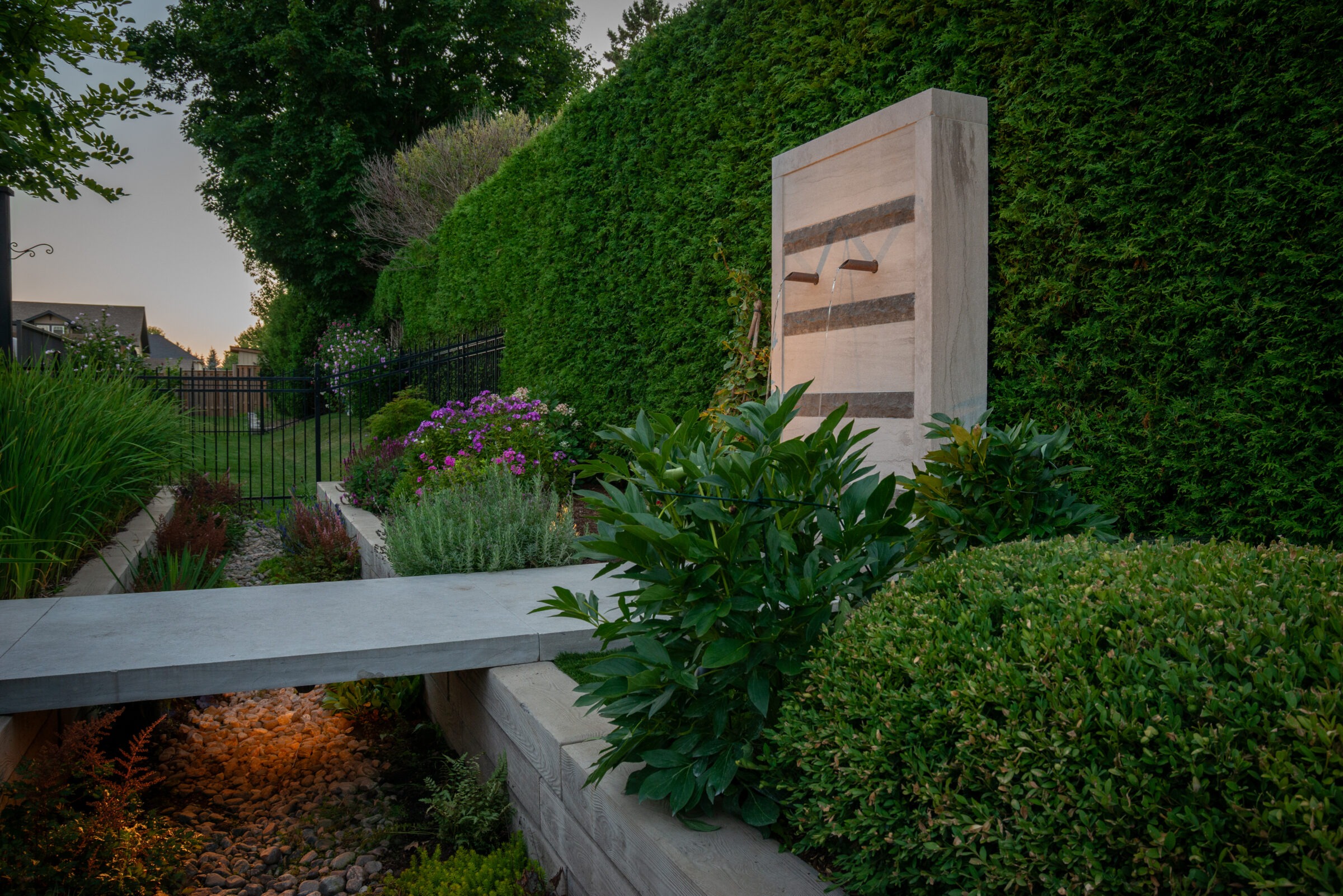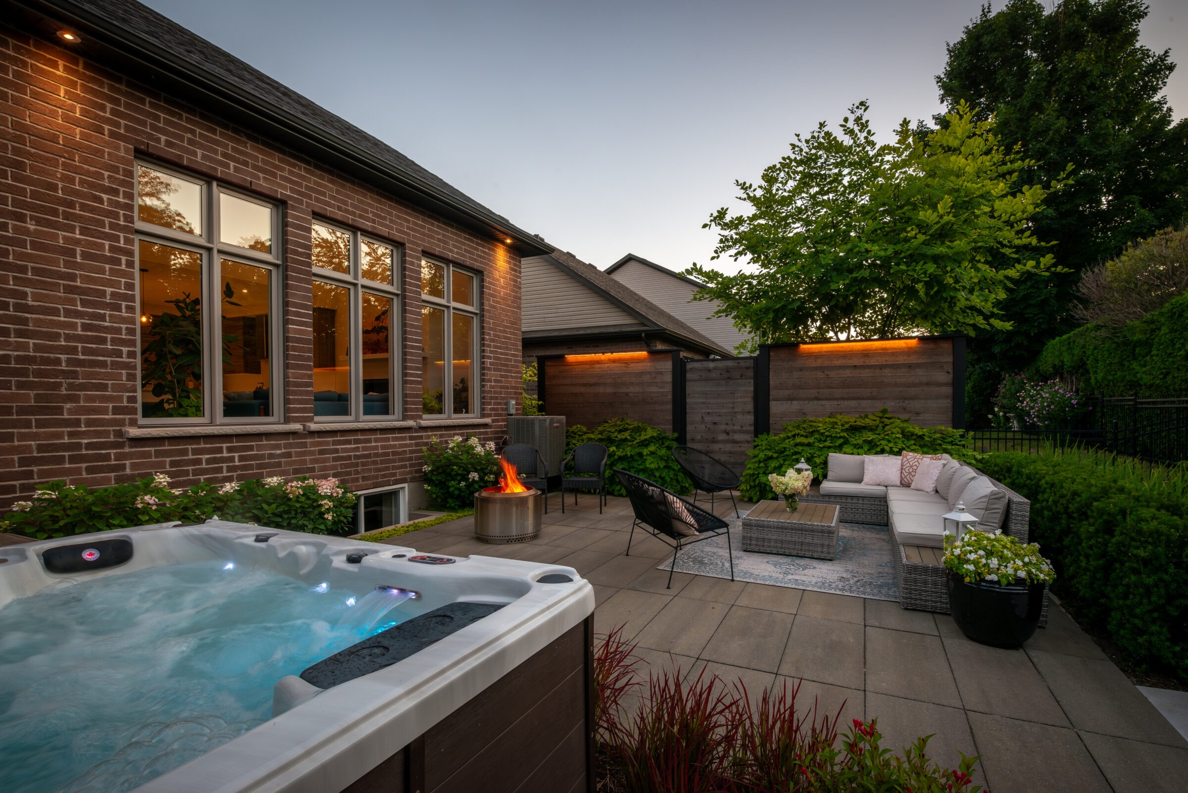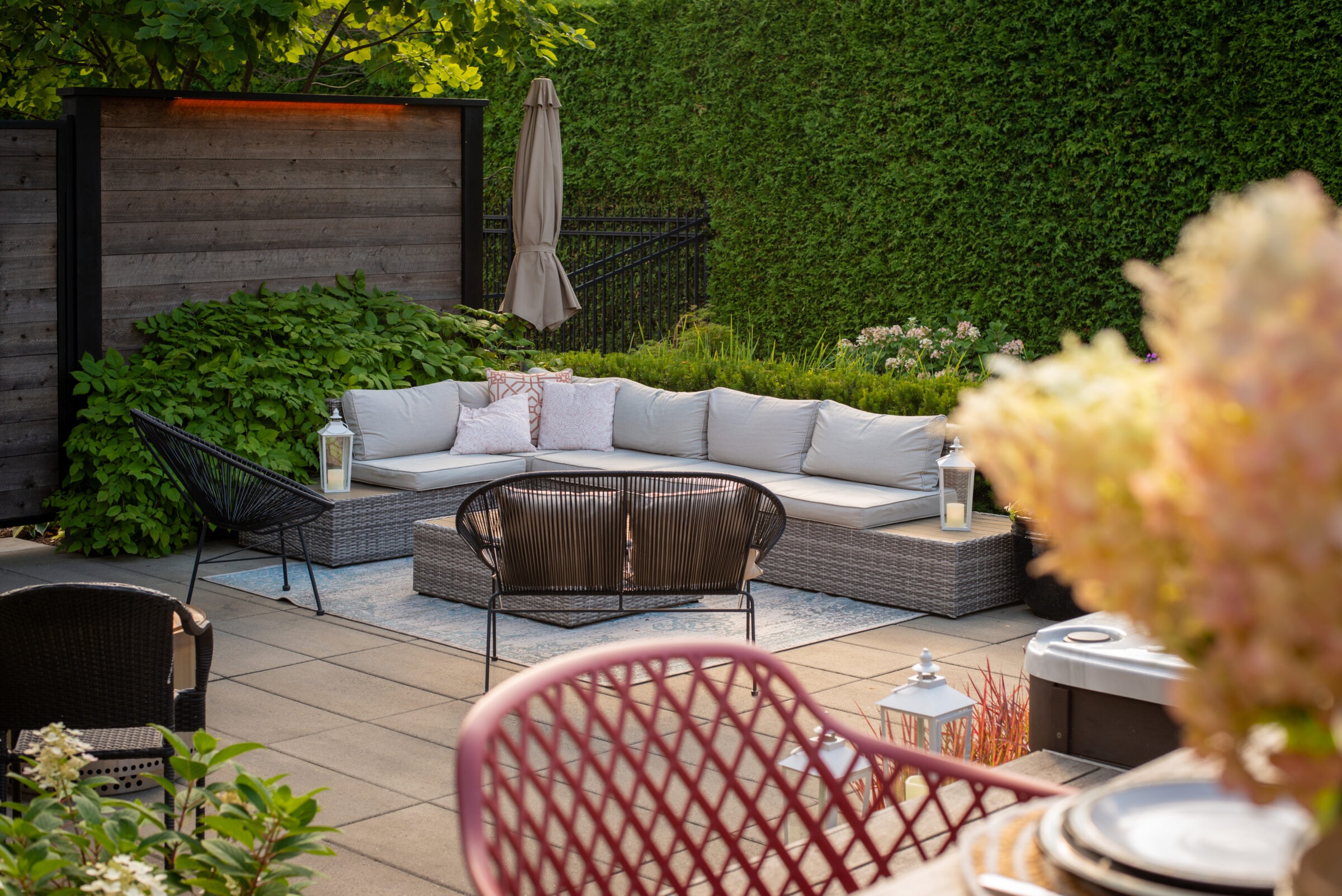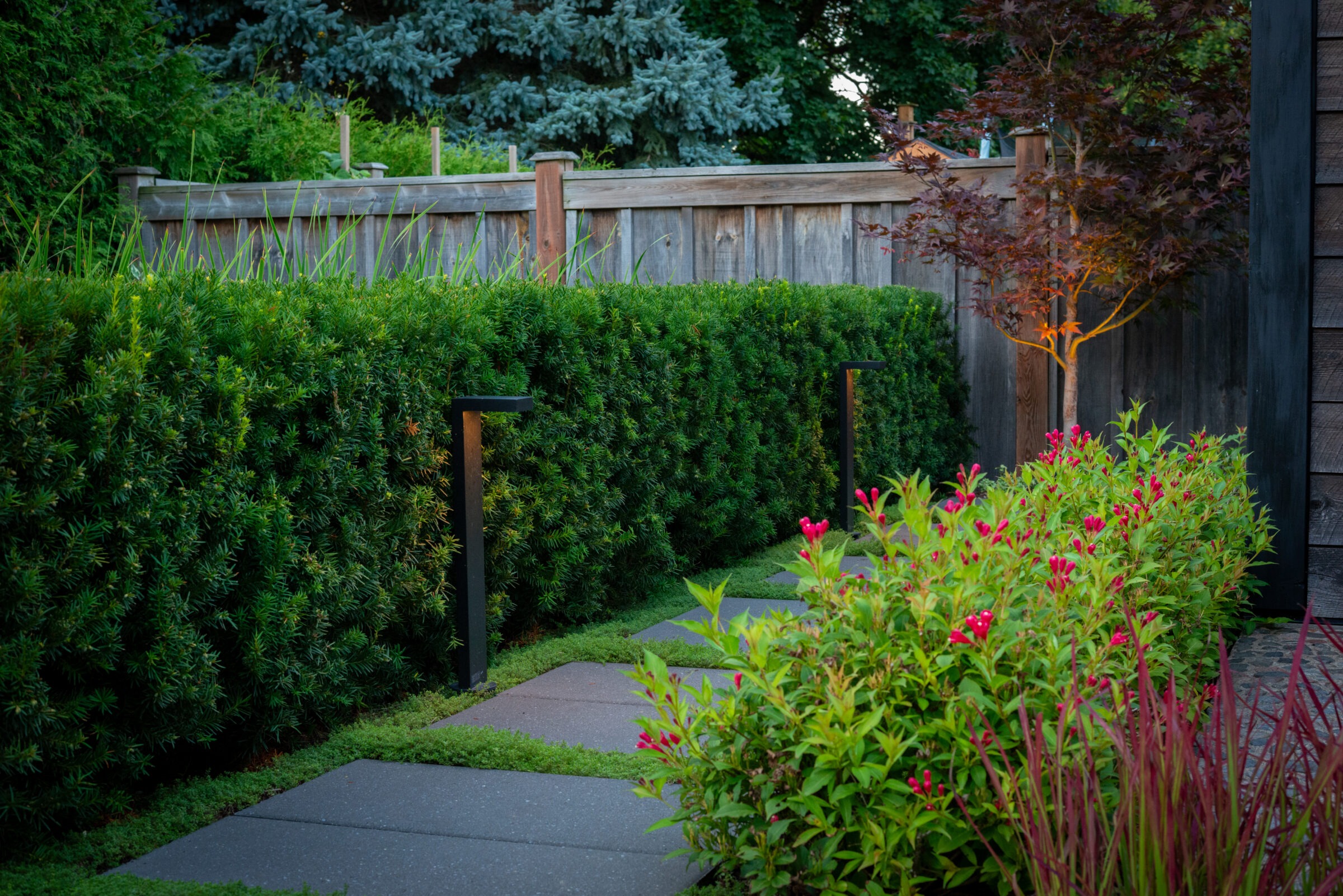 Westminster Gardens was designed as a private retreat that blends relaxation, entertaining, and year-round enjoyment. The backyard was transformed into a modern yet timeless outdoor living space centered around a spa and lounge area framed by lush plantings and warm privacy screens. An expansive sectional and fire feature create cozy gathering spots, while a custom dining terrace invites family and friends to share meals outdoors. Carefully planned gardens, pathways, and accent lighting tie the spaces together, creating an inviting retreat that feels like an everyday escape at home.