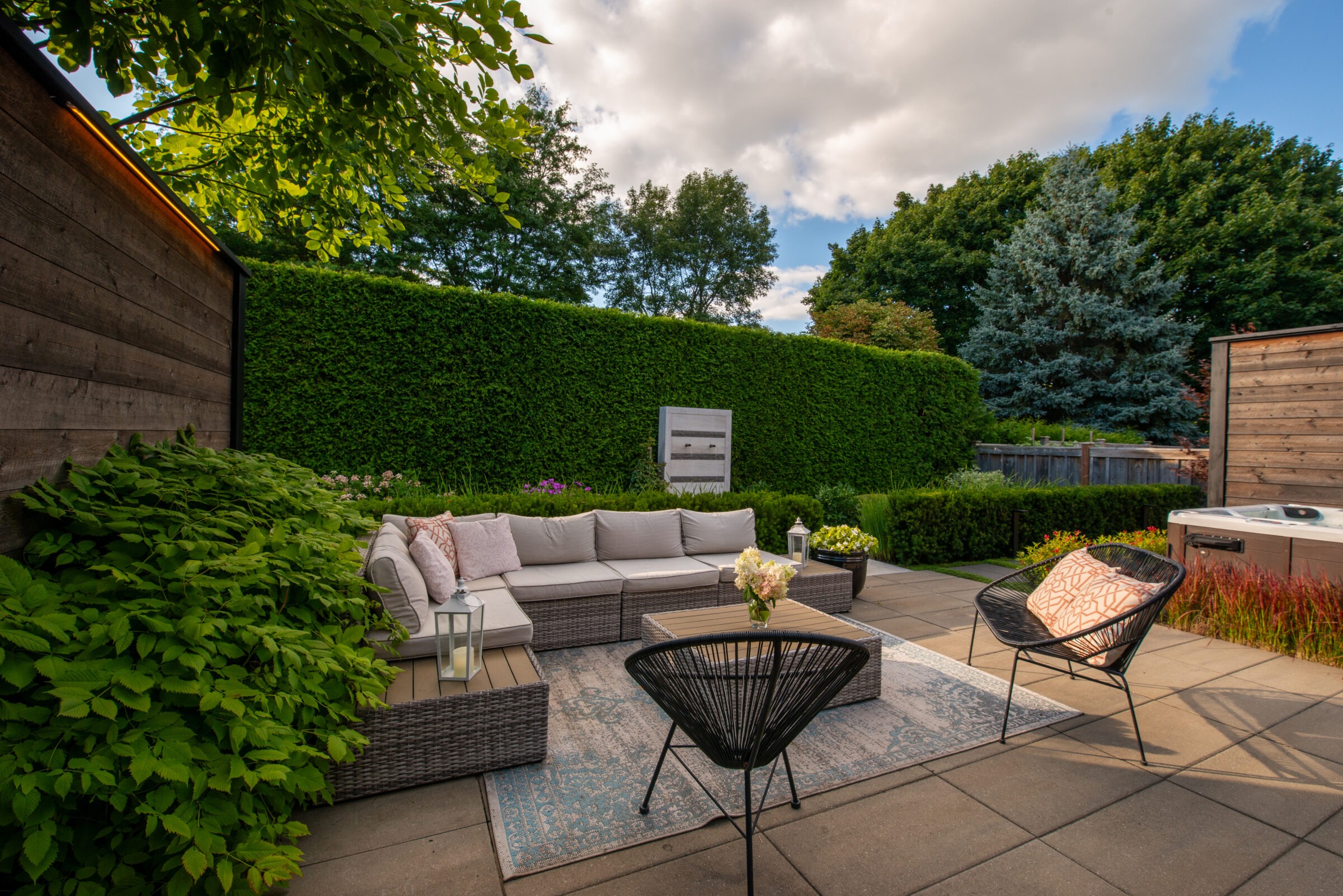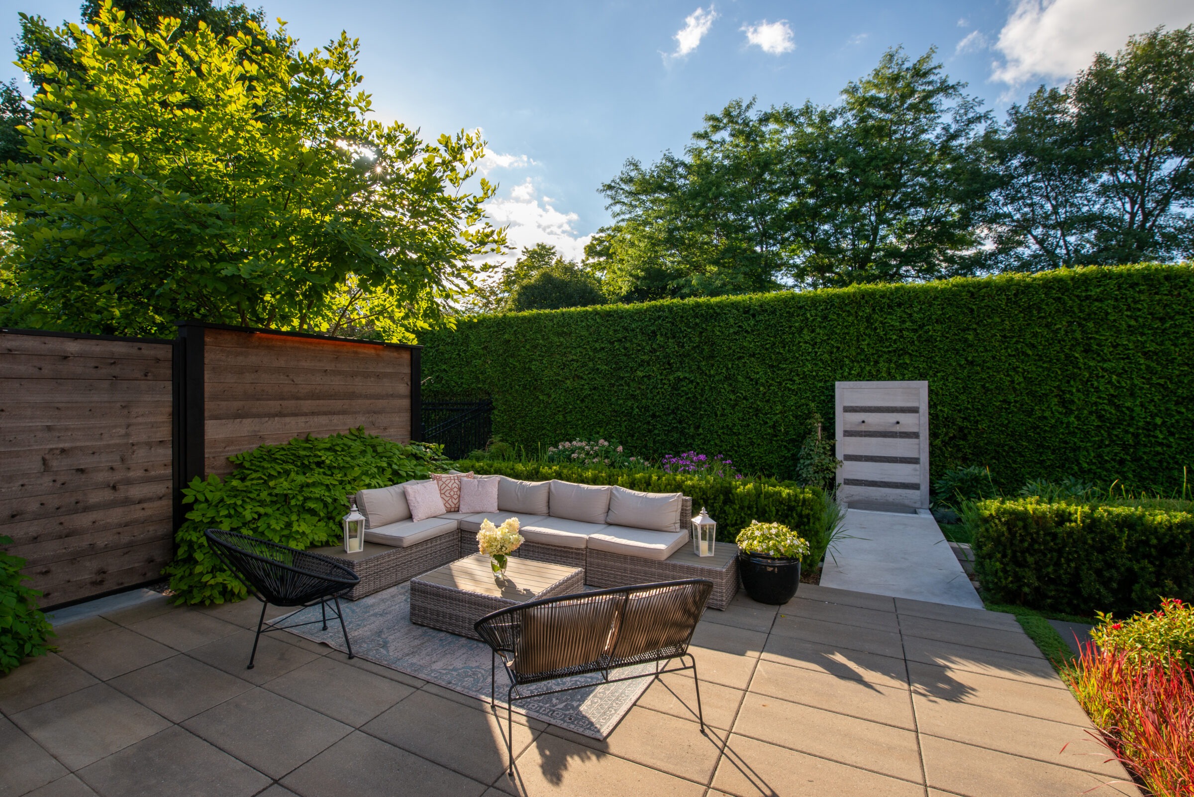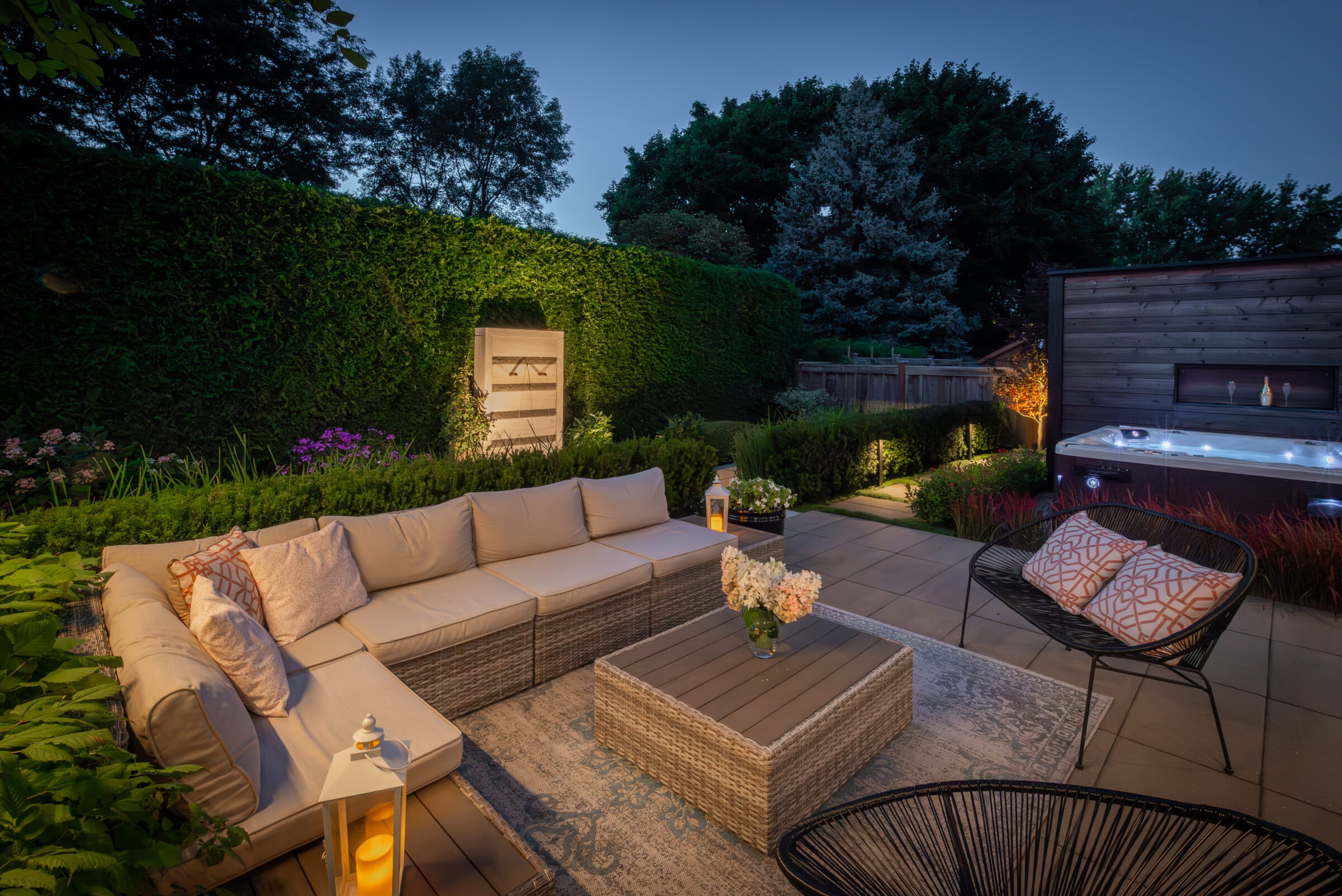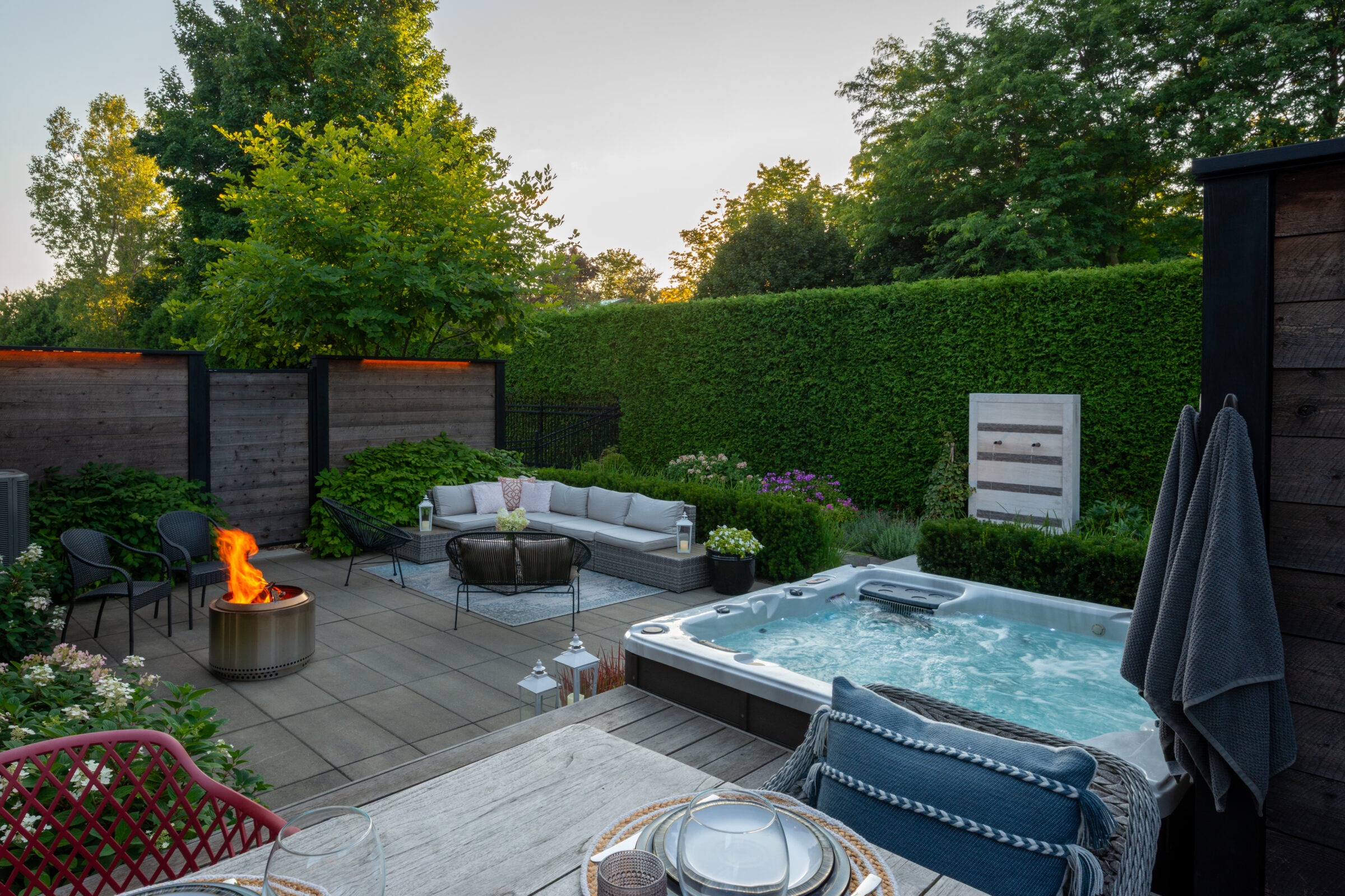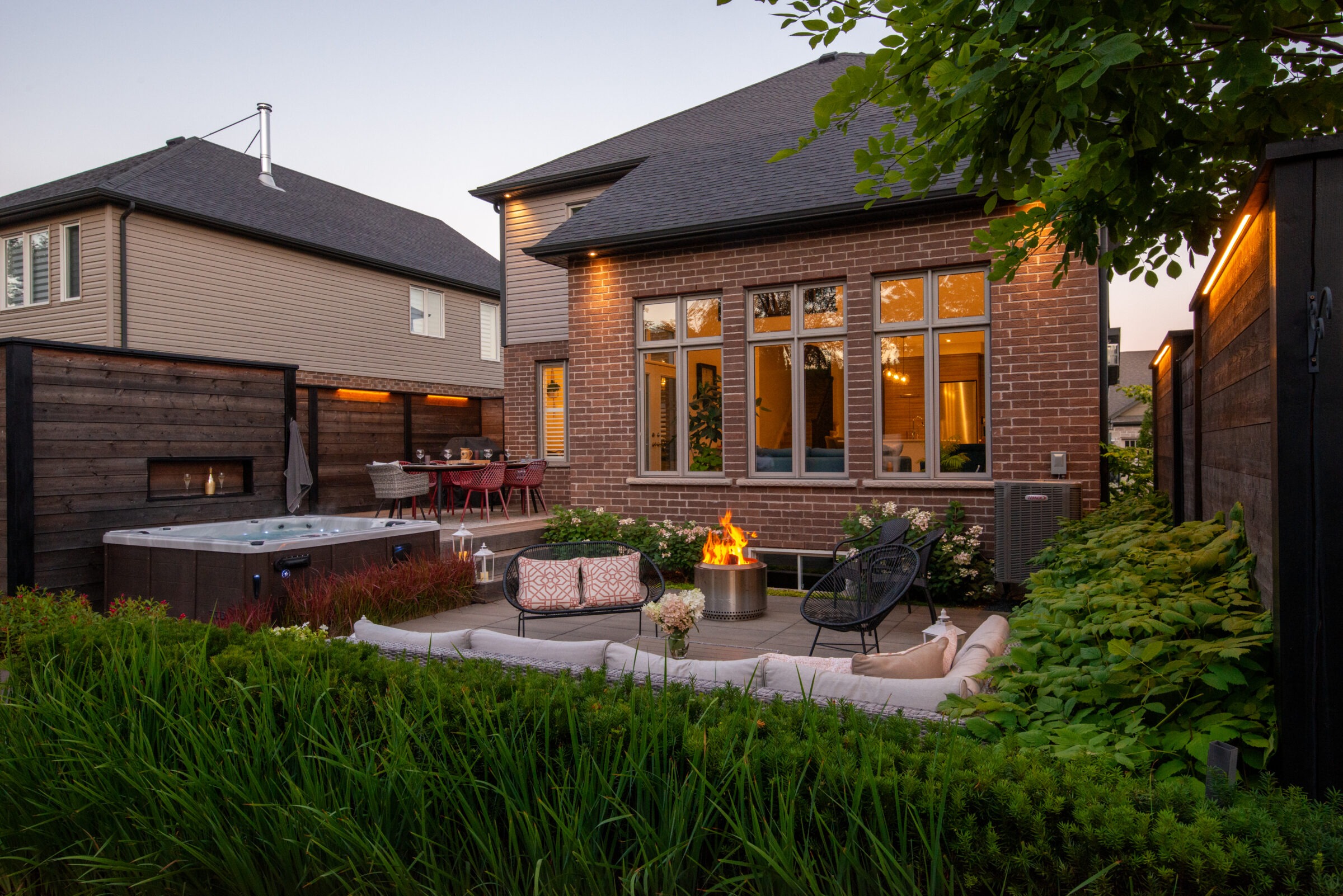 Westminster Gardens was designed as a private retreat that blends relaxation, entertaining, and year-round enjoyment. The backyard was transformed into a modern yet timeless outdoor living space centered around a spa and lounge area framed by lush plantings and warm privacy screens. An expansive sectional and fire feature create cozy gathering spots, while a custom dining terrace invites family and friends to share meals outdoors. Carefully planned gardens, pathways, and accent lighting tie the spaces together, creating an inviting retreat that feels like an everyday escape at home.