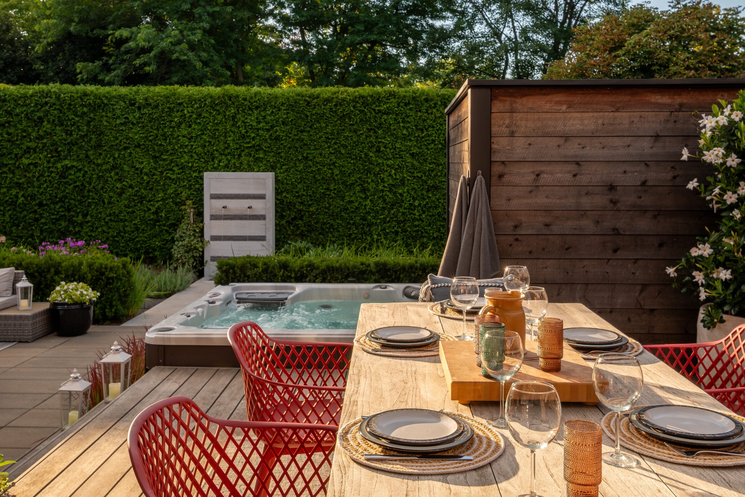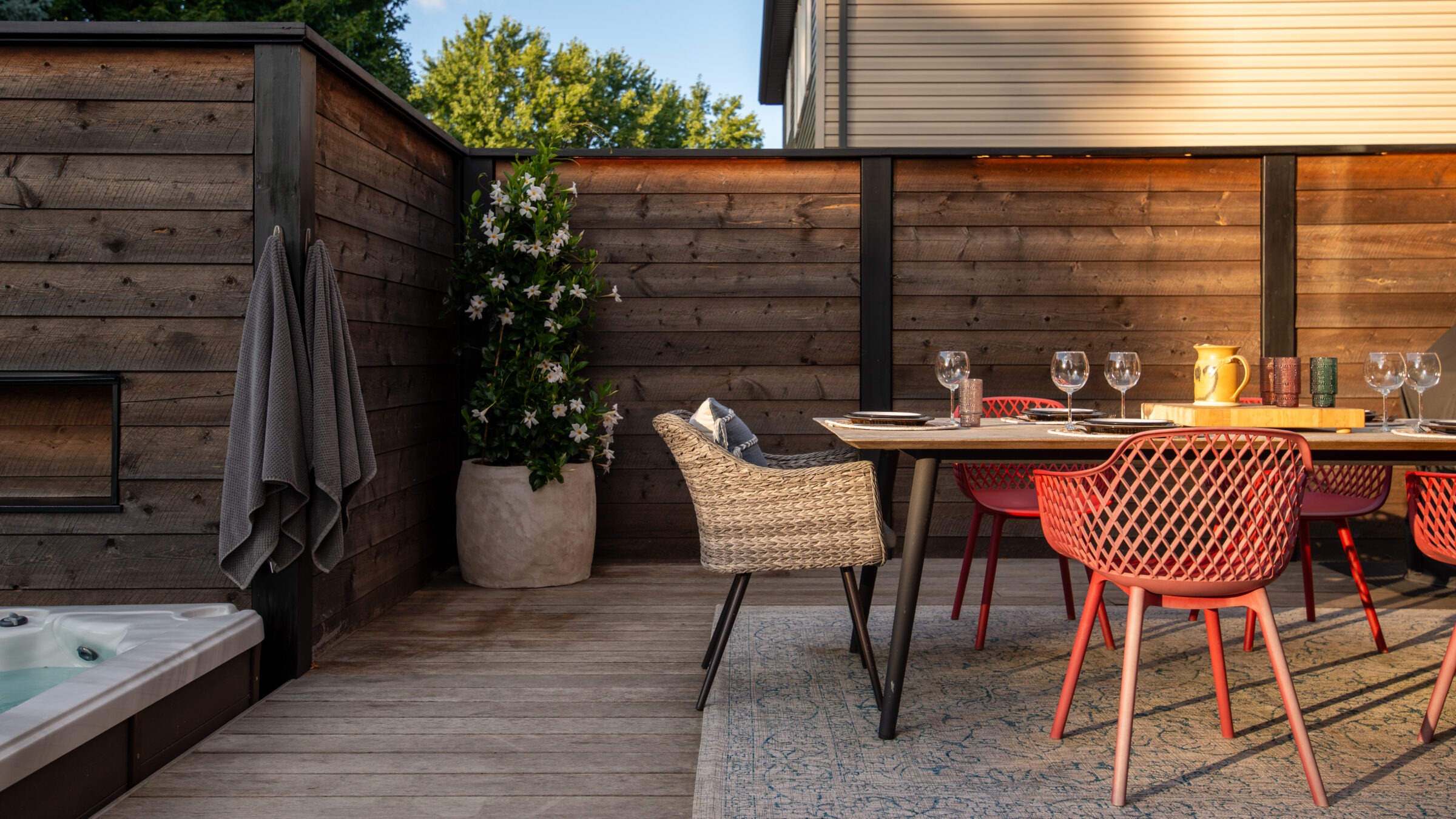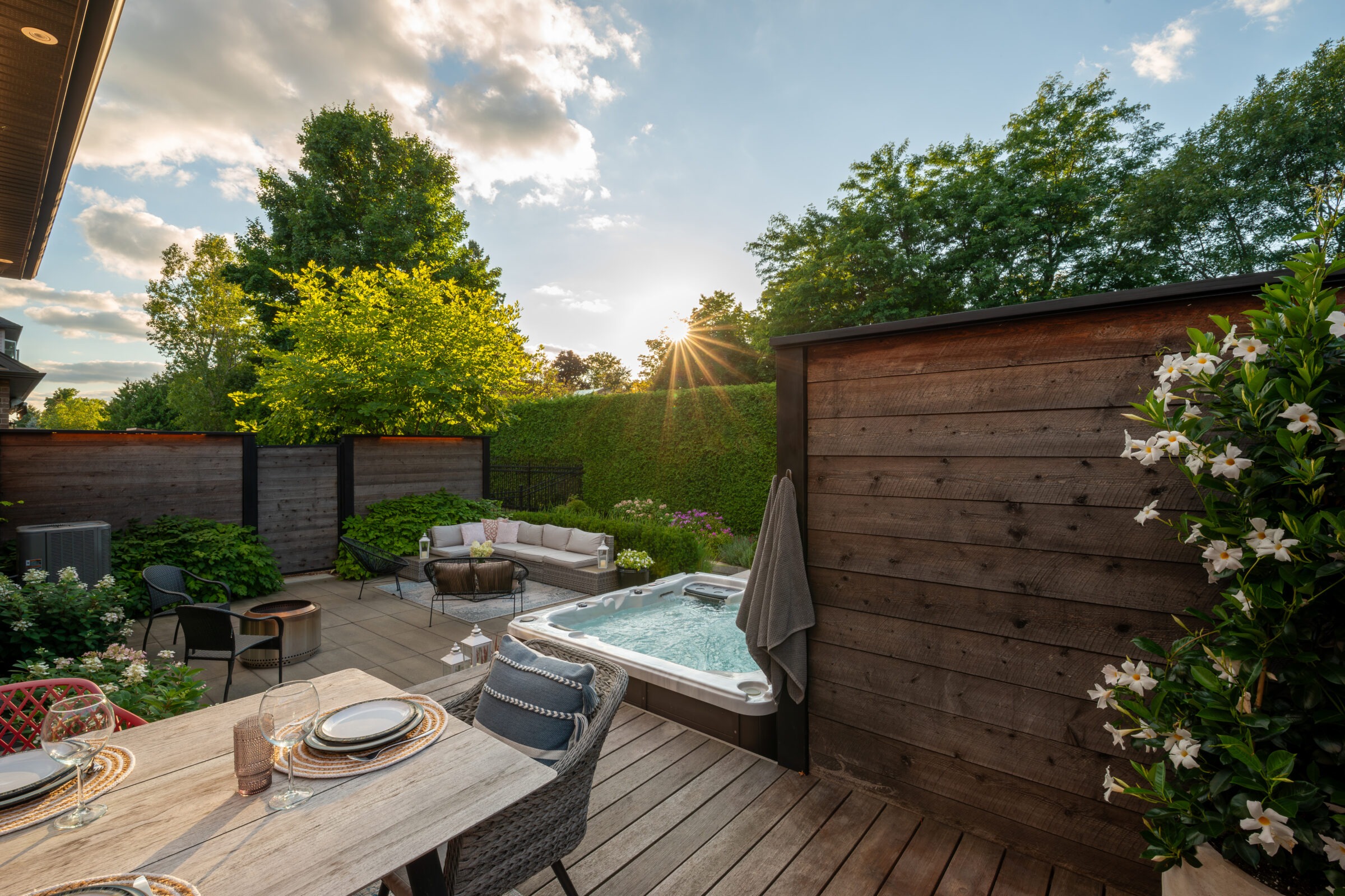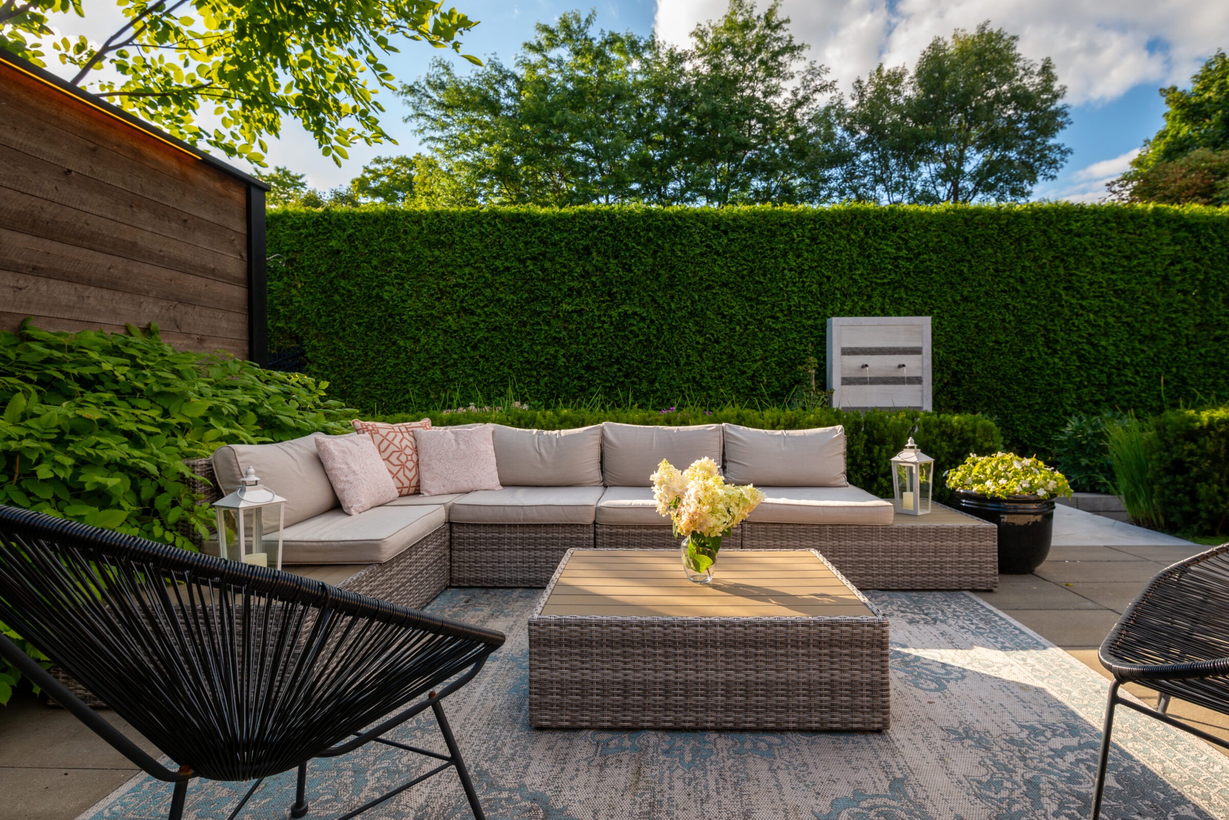 Westminster Gardens was designed as a private retreat that blends relaxation, entertaining, and year-round enjoyment. The backyard was transformed into a modern yet timeless outdoor living space centered around a spa and lounge area framed by lush plantings and warm privacy screens. An expansive sectional and fire feature create cozy gathering spots, while a custom dining terrace invites family and friends to share meals outdoors. Carefully planned gardens, pathways, and accent lighting tie the spaces together, creating an inviting retreat that feels like an everyday escape at home.